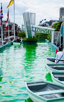 For the past few weeks, the Studio Toogood has been giving life to an ambitious project on top of the mythic building of Selfridges, in London. The project, inspired by the legendary Gondola Banquet of 1905, consisted on flooding Selfriges rooftop with a green fluid imitating a new sweetener, Truvia. Guests are now able to experience the discovery but only untill tomorrow 24th July.